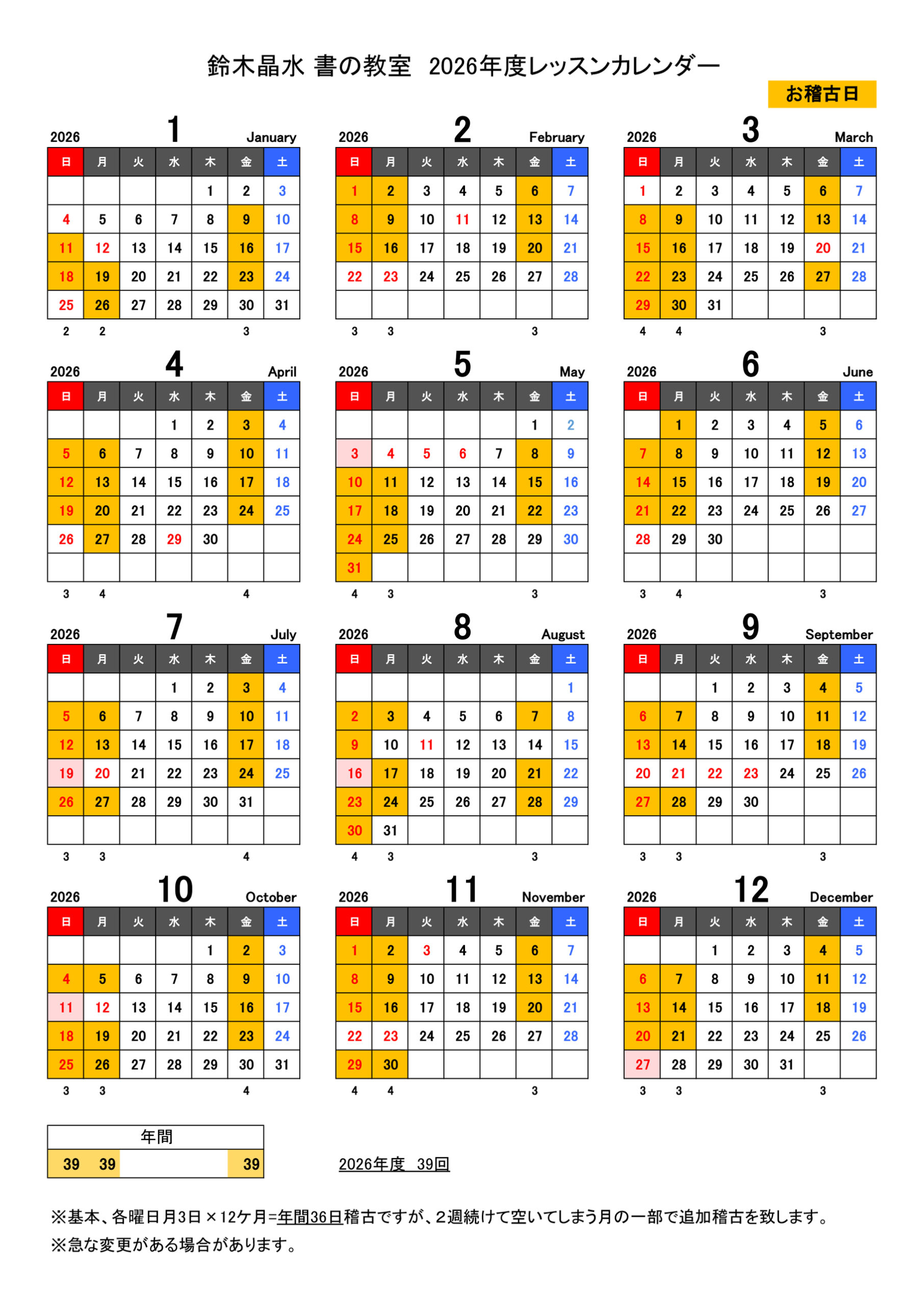 お稽古日カレンダー